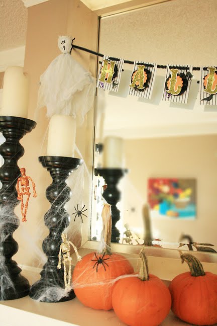 We decorated the house this weekend for Halloween. As per my kids, I needed to make it a little more spooky then my borish decorations from previous years. Hey…I keep it pretty tamed. I’m not too into the scary side of Halloween. I was excited to get out my Martha Stewart Halloween glitter set that I bought last year at the end of the season for 50% off. It sat for a whole year and I’m glad I didn’t forget about it. I made a glitter Halloween banner that should last a few years. And the kids glittered up some plastic skeletons that we used on a wreath that I spray painted black. Cobwebs and plastic black spiders are an easy Halloween decoration. As you can see, I’m not too into kitschy holiday decor that just adds clutter. But that’s just me!