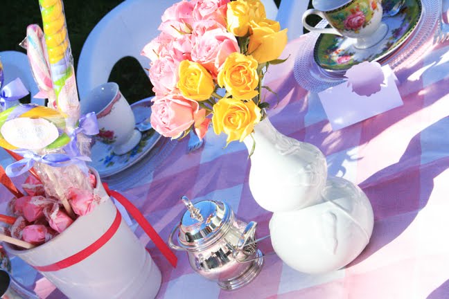 I gorilla-glued cheap teacups and saucers together to make a tall flower centerpiece. And made a lollipop garden centerpiece with “stella’s tea party” labels.