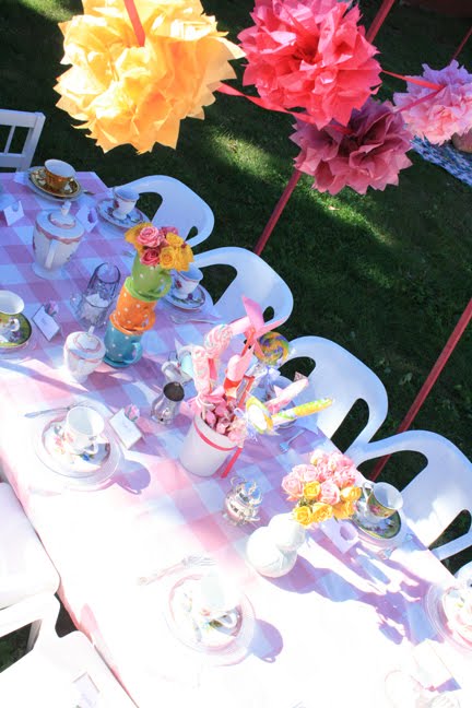 I rented an eight-foot children’s table and chairs, and we squeezed 16 girls around it. I found matching gingham fabric to the invitations and sewed a tablecloth. From my tissue paper supply box, I made four paper pom pom garlands and strung it across the table. They were supported by six-foot wooden stakes that I spray painted pink.