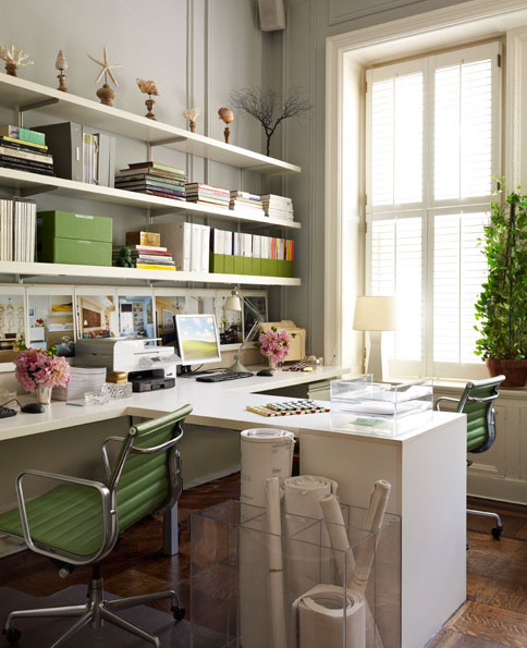 I’ve made a goal this year to try to organize something around the house each month. This month I’ve been working on my sun room/studio. It’s been a disaster for the longest time. It’s amazing how much you accumulate within a few years. I’ve added pops of green filing boxes on my open shelves and I really like the look. Then I saw the image below and knew I was on the right track (although my studio doesn’t look nearly as beautiful as this one). Oh, and those Eames green chairs–love them!