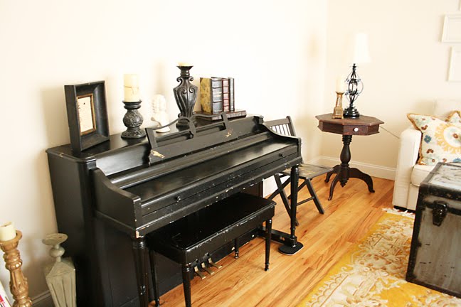 I love her black painted piano. It adds so much character to the room and keeps with the vintage style.