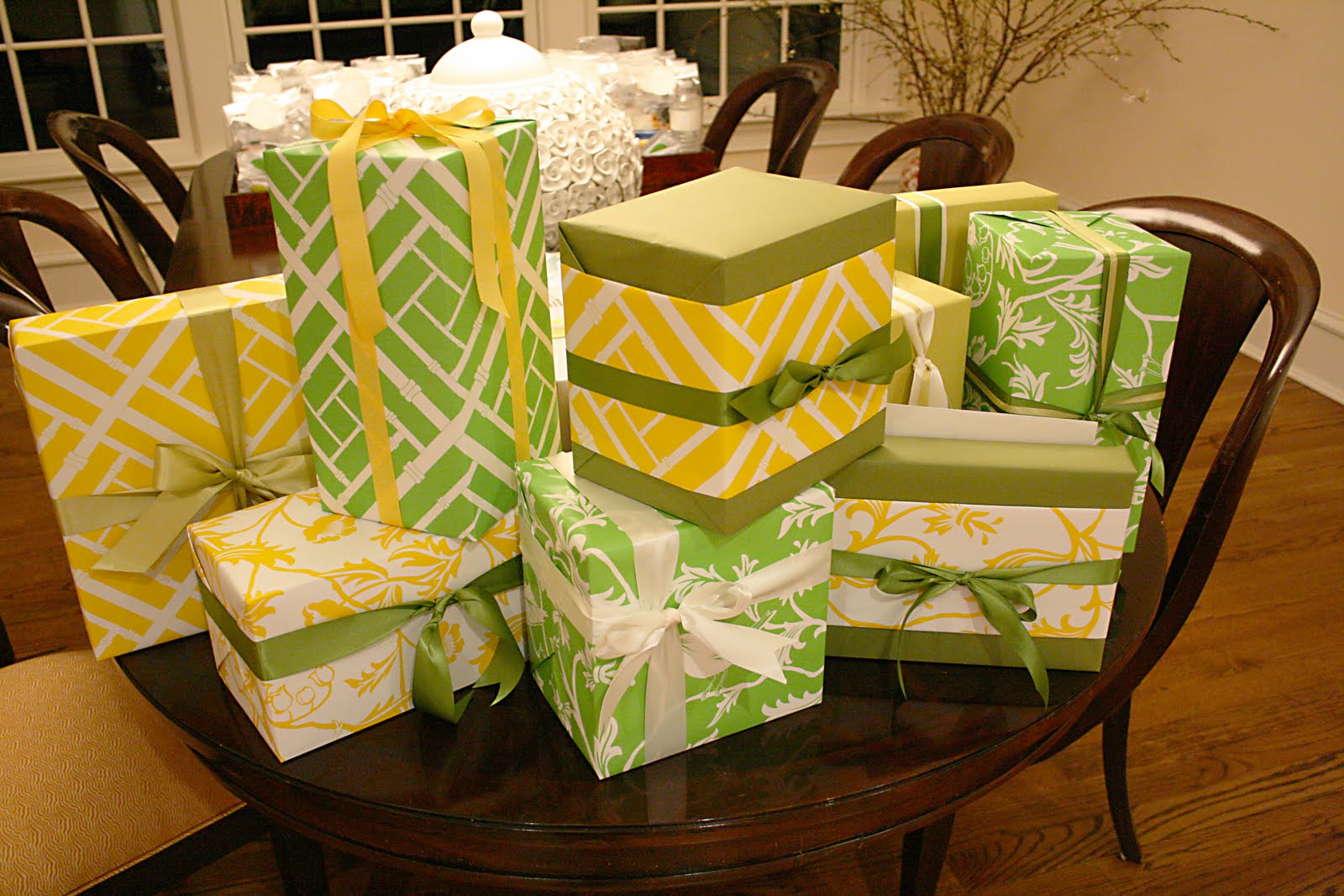 I thought this was a clever idea that the hostess did for a baby shower I recently went to. She asked all the guests to drop their presents off at her house prior to the party for free custom wrapping. She then wrapped all the presents in paper with colors and patterns that coordinated with the shower’s theme. The look was beautiful and added to the party decorations.