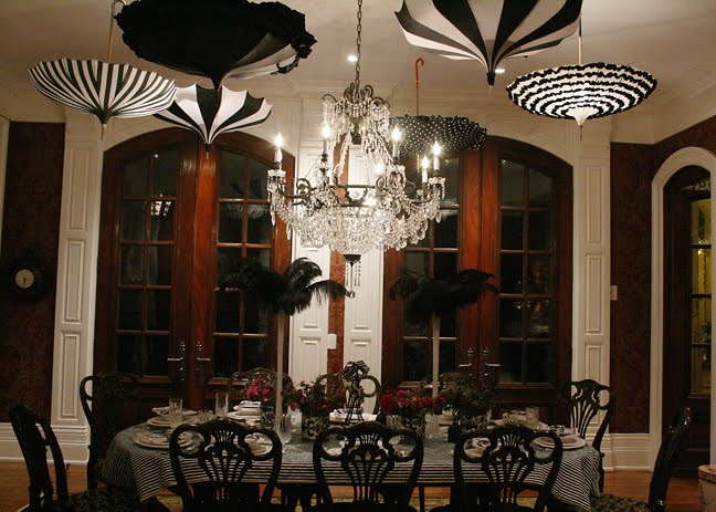 The dinner was held at the home of Ashley’s parents, which is elegant and very French. Really no decorations were needed…but I decided to add a few. I took vintage black and white umbrellas and hung them upside down from the ceiling. I used the 3m hooks to suspend the umbrellas and they left no marks on the ceiling. Great way to make a grand entrance! The umbrellas gave that Parisian feel and made the party intimate and whimsical.