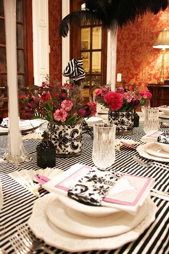 You can never go wrong with flower centerpieces of peonies and tulips, and this is where the eggplant purple was incorporate in the table setting. Do you see where I used my damask wrapping paper?