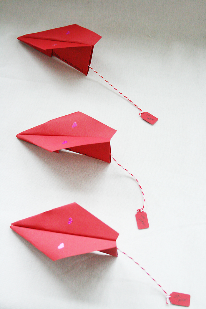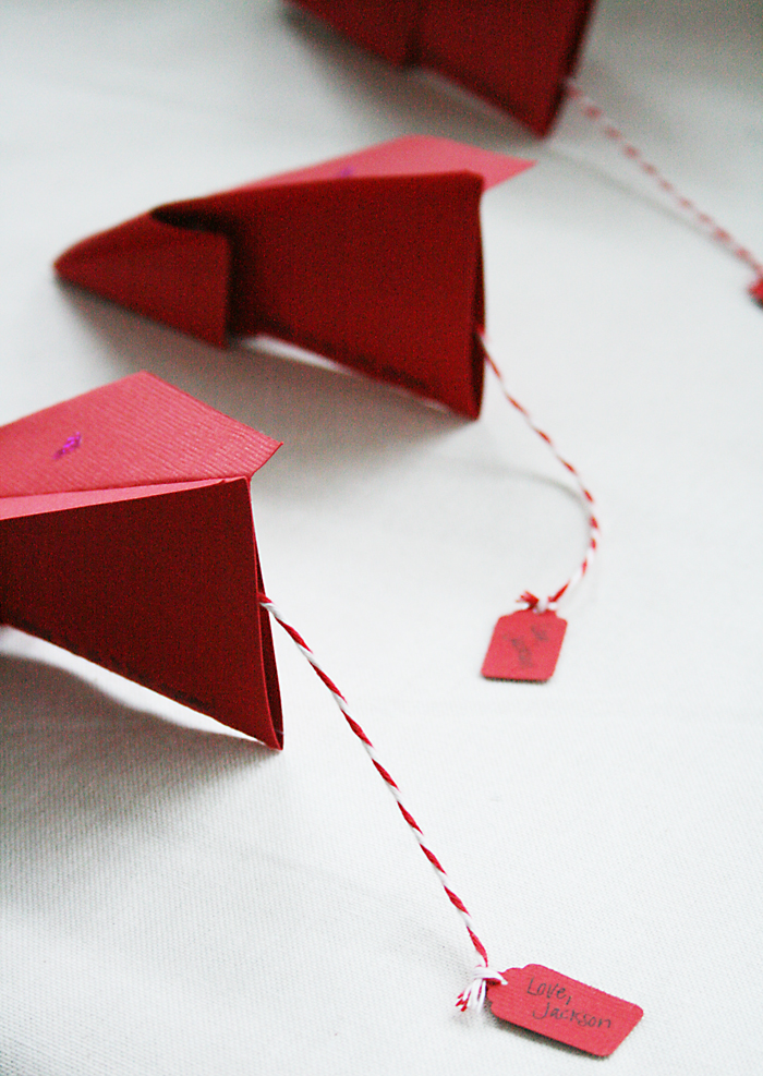 Here’s the last but not least of this year’s Valentines! These valentine’s are really easy and fast to make. For my littlest guy, who is apart of joy school this year, we made paper airplanes because they are fun to fly and I was running out of time! These valentines were thrown together at the last minute and items came from around the house–red paper, heart stickers, red baker’s twine, large clear adhesive dots (to secure the airplane from coming apart). I enlisted my hubby to help and he made the airplanes. I secured it with adhesive dots, attached some baker’s twine to the plane and a little tag. Took a black pen and wrote “valentine, you are PLANE awesome!” and on the tag “love, jackson”. My plan was to attach some lollipops to the top of the plane but didn’t have any left over from the Valentine candy I had bought, so the kids instead got a little bag of random gummy valentine candies.