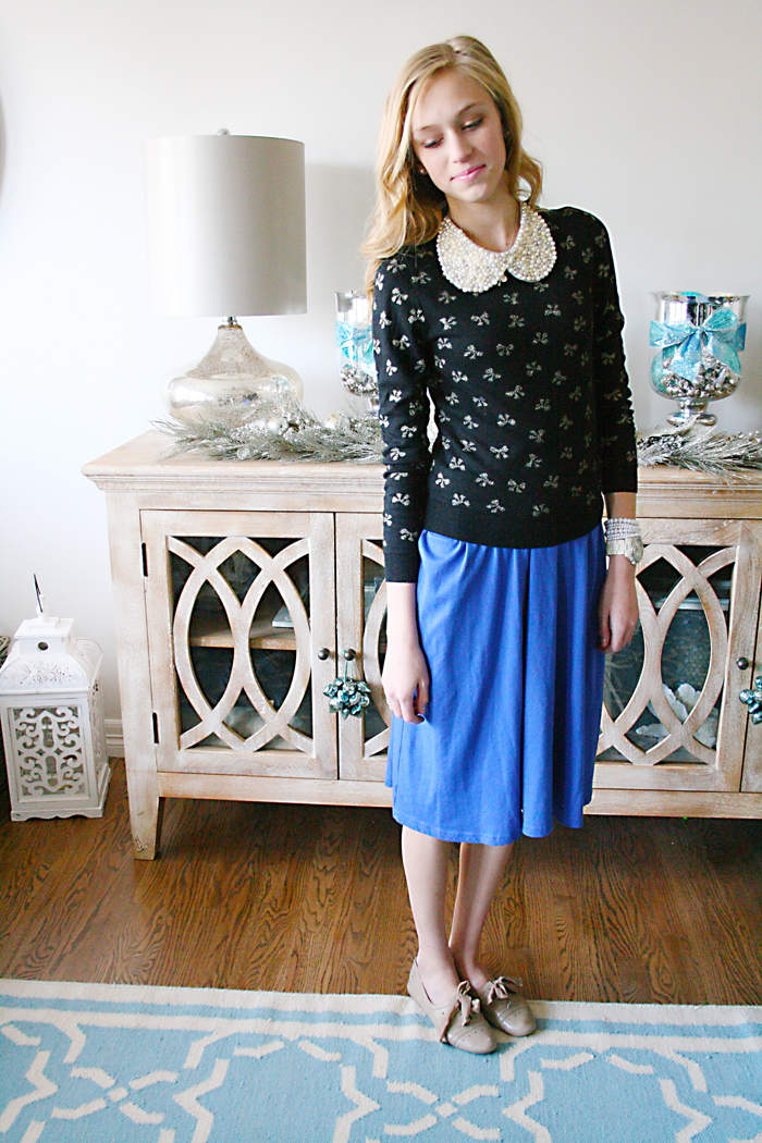 Isabel is wearing with her pearl peter pan necklace–h&m sweater, target skirt and Steve Madden shoes.
