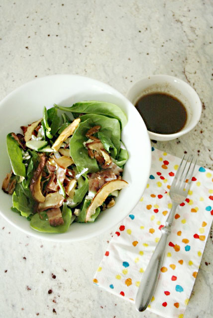 Throw all the salad topping together in a large bowl. I like to make my own dressings…it’s so much better than store-bought. And to tell you the truth, I tend to just kind of throw it all in a small bowl too. Not a lot of measuring going on. But one helpful thing to remember when you are making your own dressing is that oil is two times more than vinegar.
