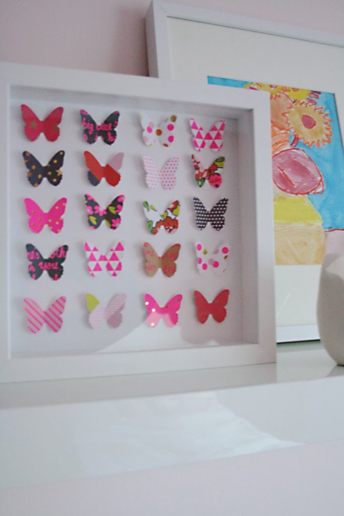 This darling paper butterfly artwork project is so easy, a five year old can do it! Seriously. My five year old made this art piece for his sister…with a little assistance of course. For Christmas, we do handmade sibling gifts–a tradition we started a few years back. My children love this tradition, and the one-on-one craft project they get to do with mom. I try to think up homemade items that can be well appreciated for many years to come. In the past, we’ve made homemade star wars t-shirt designs, hair bows, friendship bracelets, wooden puzzle pieces, constellation lights, personalized snow globes, monster gloves. I’m always planning to blog about it, but then I forget. But this project I documented and I’m now posting!