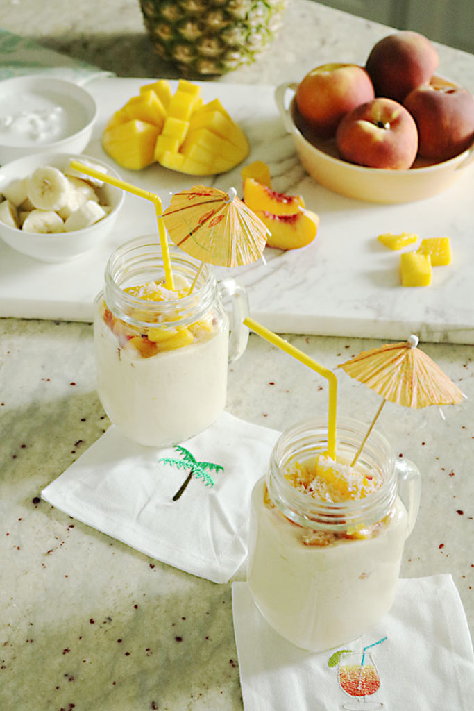 Add everything in a blender and blend until a thick, smooth consistency. Pour in glass. Top with small diced mangos, bananas, peaches and sprinkle with shredded unsweetened coconut.